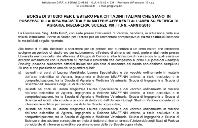 La Fondazione Ing. Aldo Gini, con sede presso l’Università di Padova, bandisce borse di studio per l’estero per un ammontare complessivo di 125.000 euro secondo le modalità di seguito riportate.