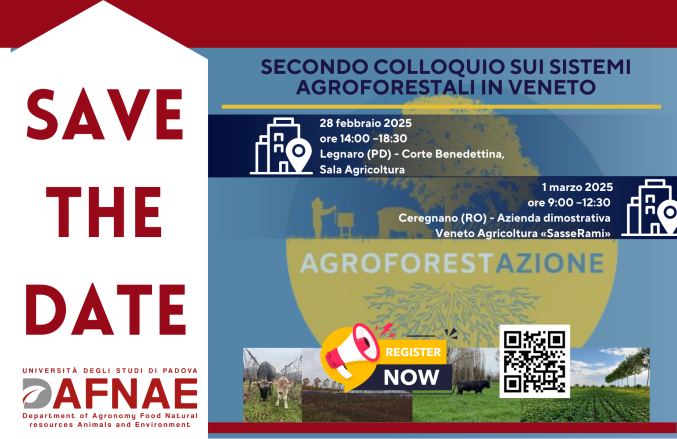 Venerdì 28 febbraio e sabato 1 marzo, si terrà l'evento AgroforestAZIONE: Secondo colloquio sui sistemi agroforestali in Veneto, organizzato dai Dipartimenti DAFNAE e TESAF dell’Università di Padova, e da Veneto Agricoltura.