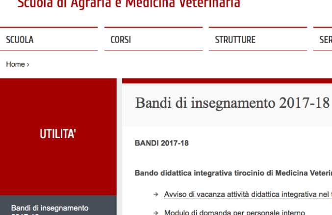 Per i bandi di insegnamento 2017/2018, si rimanda alla pagina web della Scuola di Agraria e Medicina Veterinaria: http://www.agrariamedicinaveterinaria.unipd.it/bandi-di-insegnamento-201...