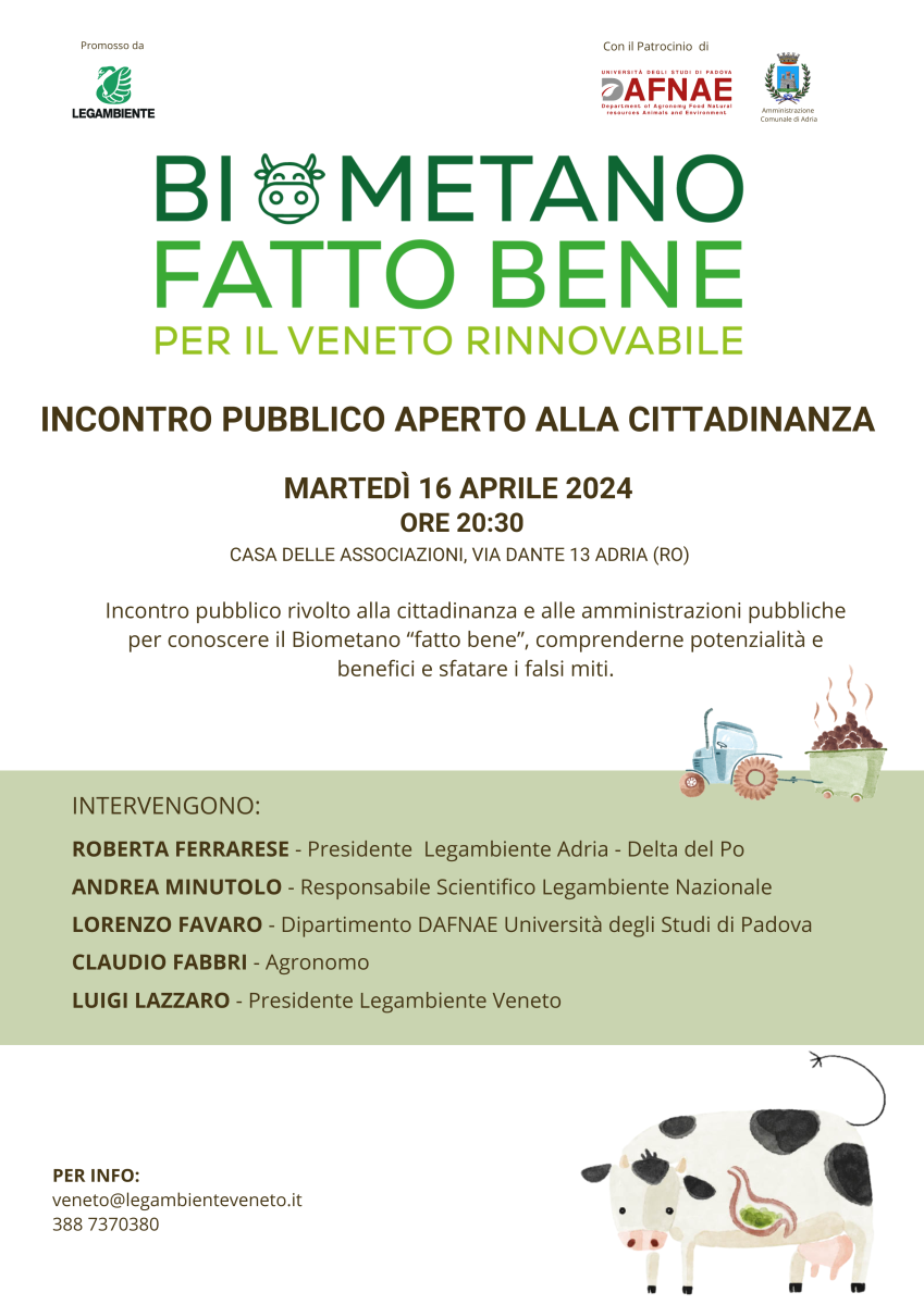 Martedì 16 Aprile alle ore 20.30 ad Adria si parlerà di biogas agricolo ed, in particolare, della campagna Biometano "fatto bene" promossa da Legambiente Veneto per comprendere le grandi potenzialità del biometano e sfatare falsi miti e fake news. Interverrà come relatore anche il Prof. Favaro Lorenzo del nostro Dipartimento esperto di microbiologia e biotecnologie microbiche (www.wastetobioproducts.com) per la conversione di scarti agro-industriali in prodotti a valore aggiunto come biogas, bioidrogeno, bioetanolo e bioplastiche.