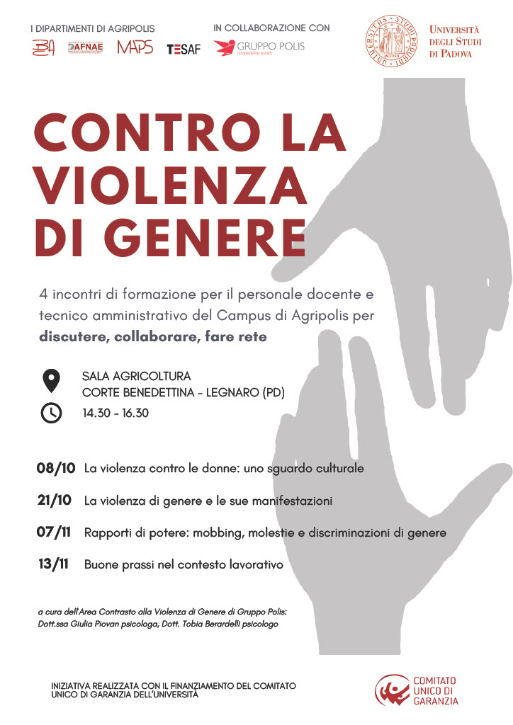A partire da ottobre si svolgeranno in Sala Agricoltura della Corte Benedettina 4 incontri formativi per sensibilizzare il personale docente, PTA, borsiste/i, dottorande/i, assegniste/i dei quattro dipartimenti di Agripolis sui temi della violenza di genere. Gli incontri sono stati organizzati in collaborazione con psicologi professionisti del Gruppo Polis operanti nel settore della violenza di genere nel territorio da numerosi anni. Il ciclo di seminari è stato approvato ed interamente finanziato dal Comitato Unico di Garanzia (CUG) di Ateneo e la partecipazione è gratuita.