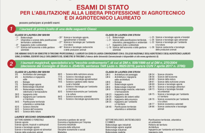 per tutti (ad esclusione dei Diplomati Universitari) è richiesto un semestre di tirocinio professionalizzante certificato ovvero un percorso equivalente (dal tirocinio sono di norma esentati i laureati provenienti da Università convenzionate con il Collegio Nazionale ovvero i soggetti con laurea magistrale o specialistica, anche in possesso di una laurea triennale. L'elenco di questi Atenei è pubblicato nel sito www.agrotecnici.it).