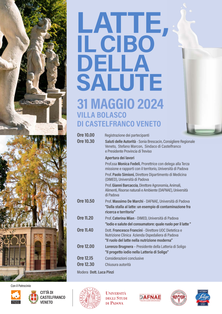 Il Dipartimento di Agronomia, Animali, Alimenti, Risorse Naturali e Ambiente (DAFNAE) in collaborazione con il Dipartimento di Medicina (DIMED), in occasione della giornata mondiale del latte, organizza il convegno dal titolo “Latte, il cibo della salute”, che si terrà il 31 maggio 2024 nella prestigiosa cornice di Villa Bolasco a Castelfranco Veneto, dalle 10:00 alle 12:30.