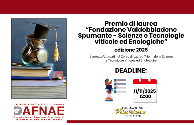 Il premio, dell'importo lordo di Euro 1.500,00 onnicomprensivo degli oneri a carico dell'ente (IRAP), è riservato a laureati in possesso della laurea triennale in Scienze e Tecnologie Viticole ed Enologiche conseguita presso l'Università degli Studi di Padova nelle sessioni di laurea comprese tra giugno 2024 e luglio 2025, che abbiano elaborato una tesi di alto profilo, per contenuto culturale e scientifico, nonché per l'originalità degli argomenti nel campo viticolo ed enologico.