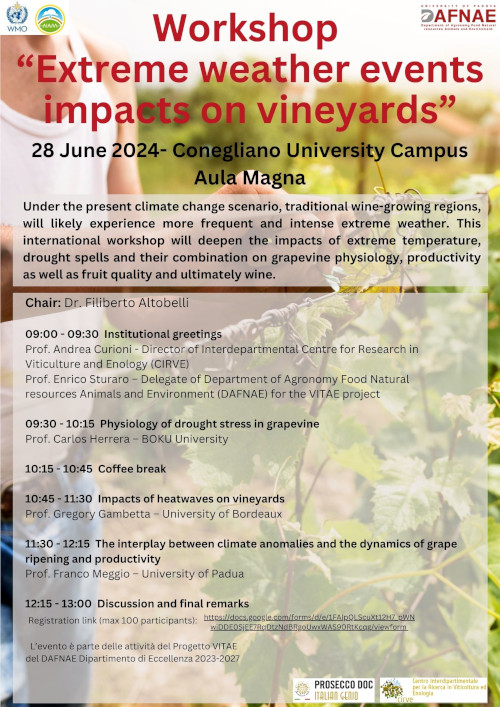 Il giorno 28 Giugno 2024 presso l'Aula Magna del Campus di Conegliano si terrà il workshop intitolato "Extreme weather events impacts on vineyards".